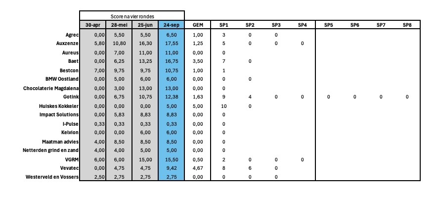 Na de vijfde wedstrijddag wordt de einduitslag bepaald door de beste vier scores waardoor ieder bedrijf één wedstrijd kan missen (vb vakantie) zonder daarmee de kans op het kampioenschap te verspelen.